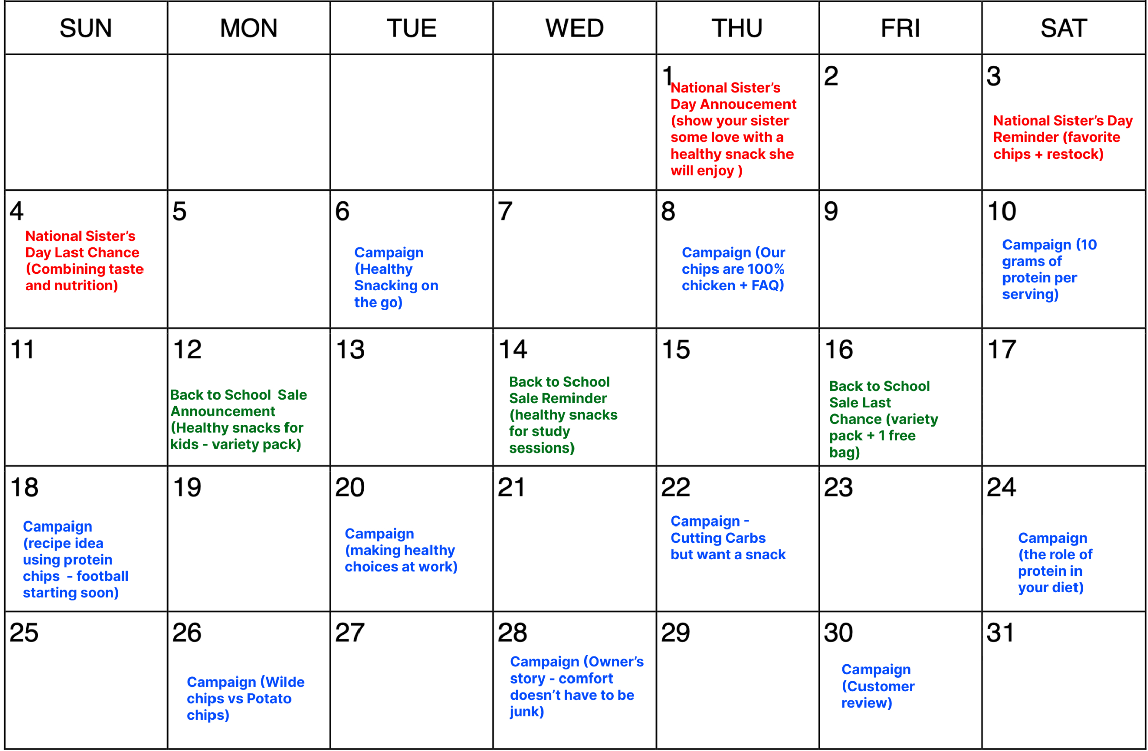Each campaign in the calendar has a specific purpose, whether it is driving a promotion, highlighting a product, or delivering value-driven content that builds trust with the audience.