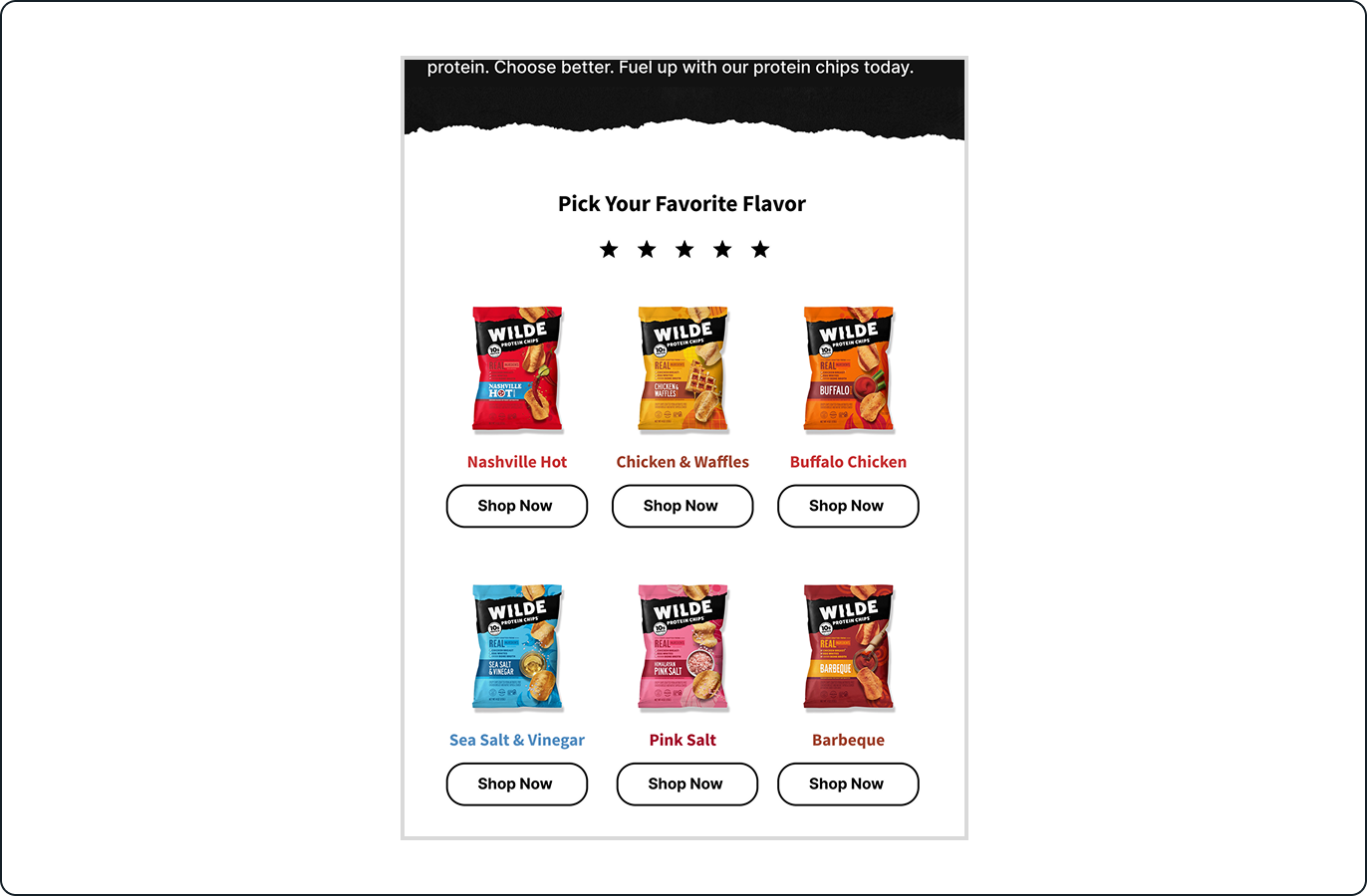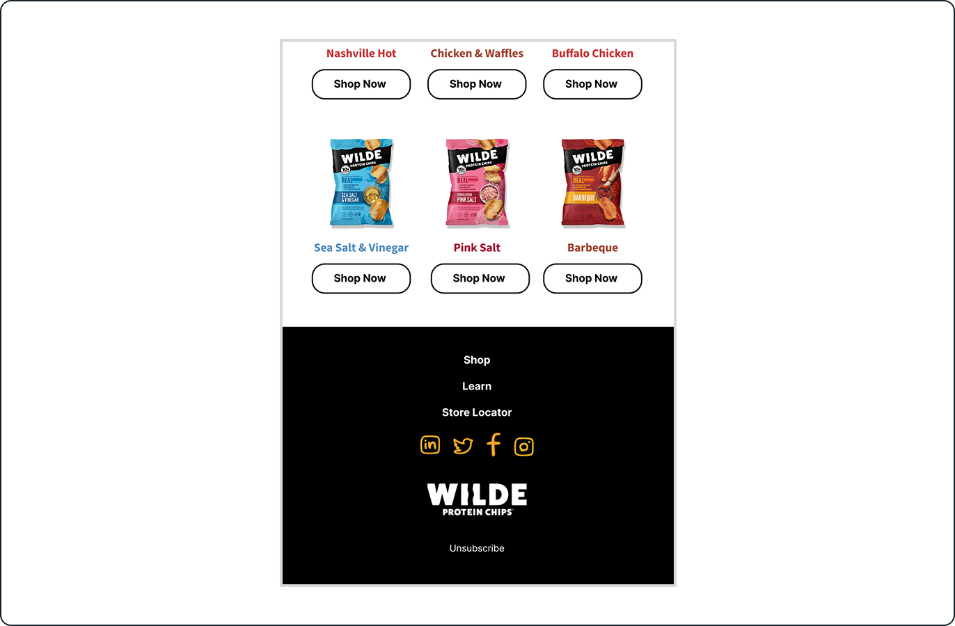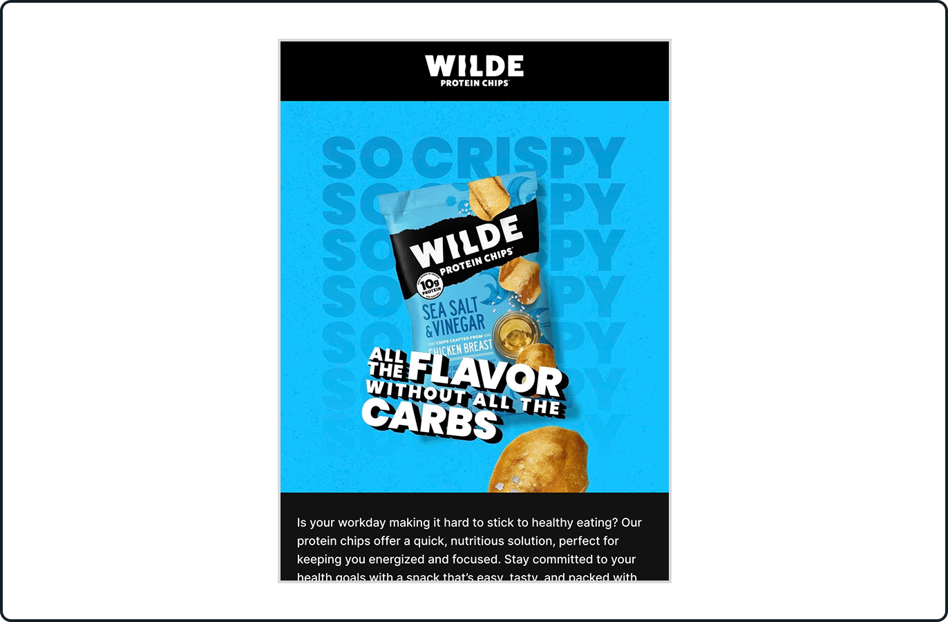 To create a well-rounded campaign mix, I planned several value-focused emails that educate and nurture subscribers. Topics such as healthy snacking on the go, the role of protein in your diet, and comparisons between Wilde chips and traditional potato chips help position the brand as a better alternative while providing useful information to customers.