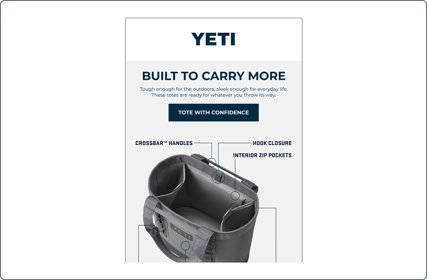 The goal of this project was to take a real marketing email from YETI and reimagine it as a cleaner, more effective customer experience. Their original send had strong photography and brand energy, but the layout felt scattered and the main message—the tote collection—got lost among competing sections. I wanted to demonstrate what a more intentional, conversion-driven version could look like.