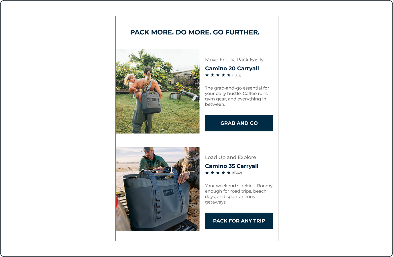 I also restructured the product lineup to create a clear flow: Camino 20 → Camino 35 → Camino 50. Each item includes a concise headline, benefit-driven copy, and an action-oriented CTA (“Grab and Go,” “Pack for Any Trip,” “Take On the Wild”). This makes the email easier to skim while giving customers meaningful reasons to click.