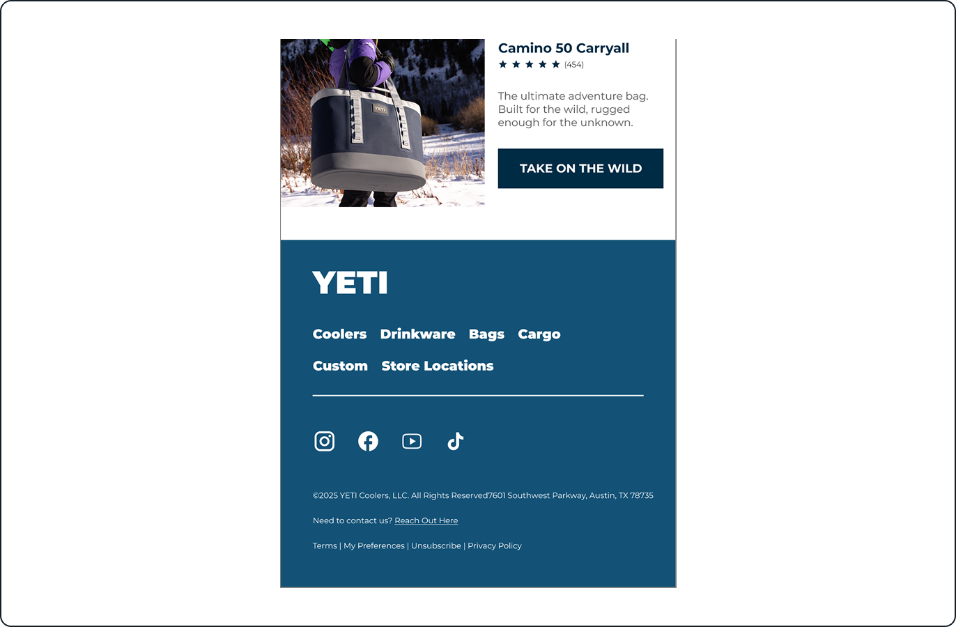 To wrap it up, I refreshed the footer to feel more modern and aligned with YETI’s aesthetic. I streamlined the categories, improved spacing, and made all links more mobile-friendly. The entire redesign was rebuilt in MJML to ensure clean, responsive, and cross-client-reliable code.
